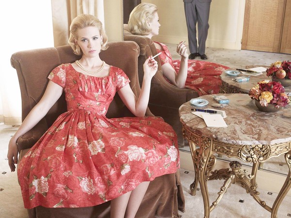 Once Betty has married well to Don (at that time an upwardly mobile copywriter for a fur company), Betty’s duties, aside from staying attractive, maintaining Don’s household, and performing perfectly as a hostess and at social functions, are done. In season 1, episode 9: “Shoot,” Betty explains to her new therapist her mother’s instructions to her for life after marriage: “She wanted me to be beautiful so I could find a man. There’s nothing wrong with that. But then what? Just sit and smoke and let it go ‘til you’re in a box?”  She faces years ahead of her with nothing in them aside from socially reflecting well upon Don.